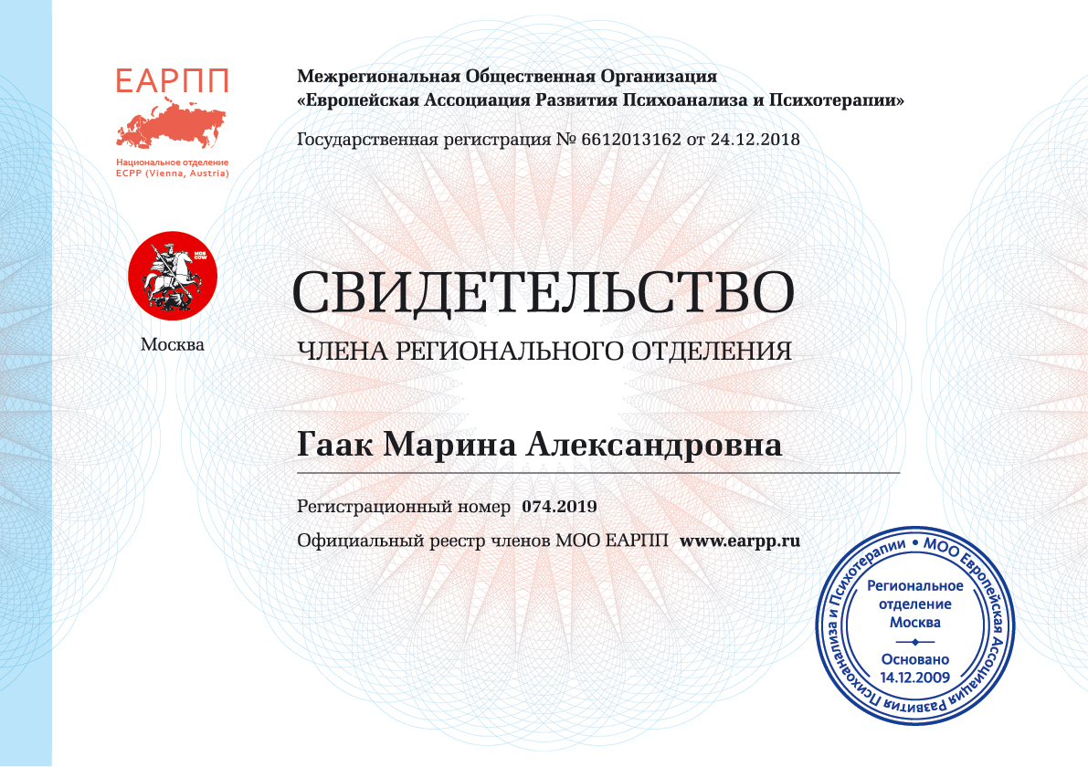 Член Европейской Ассоциации Развития Психоанализа и Психотерапии (Национальное отделение ECPP в России)