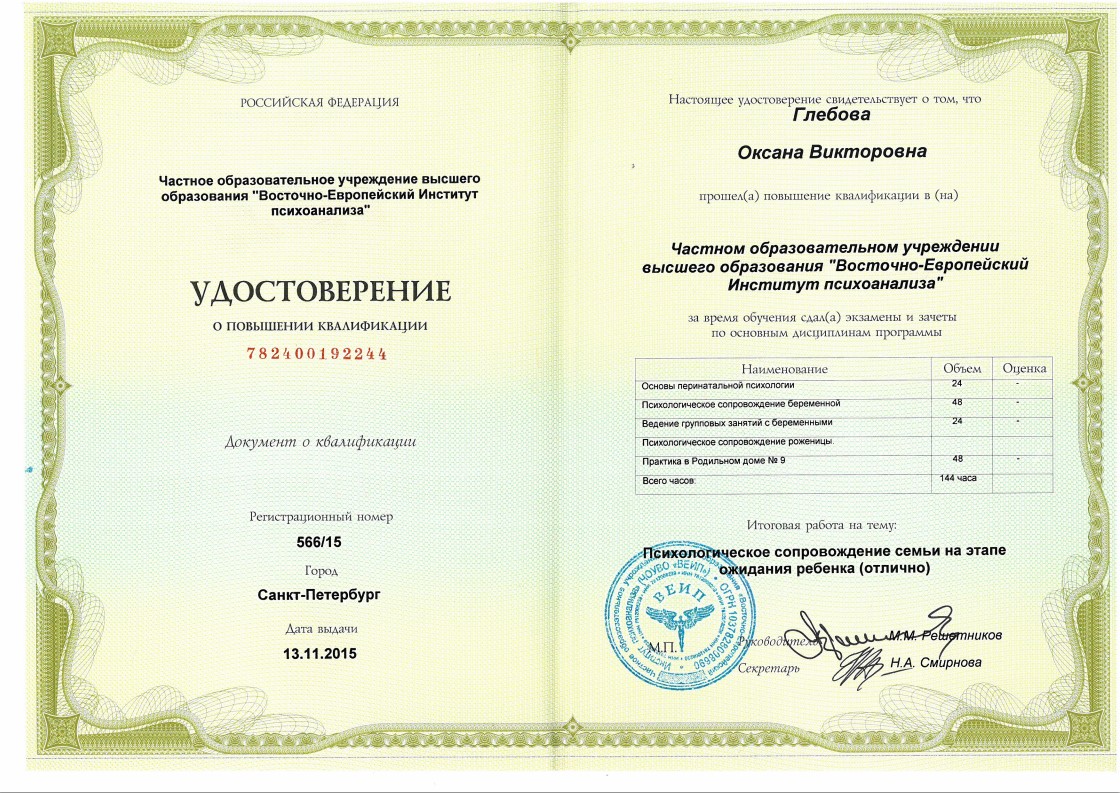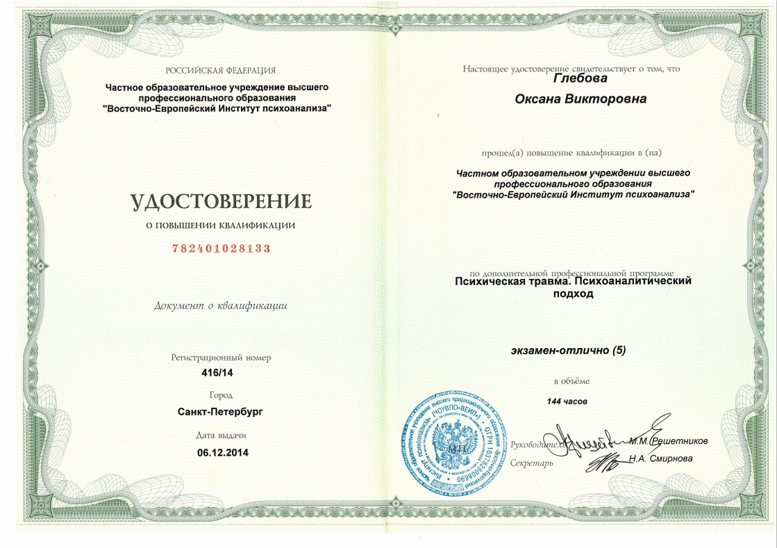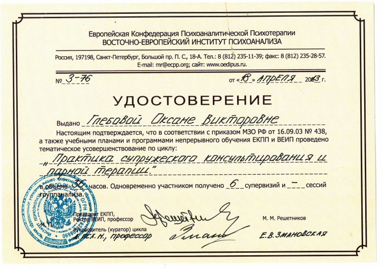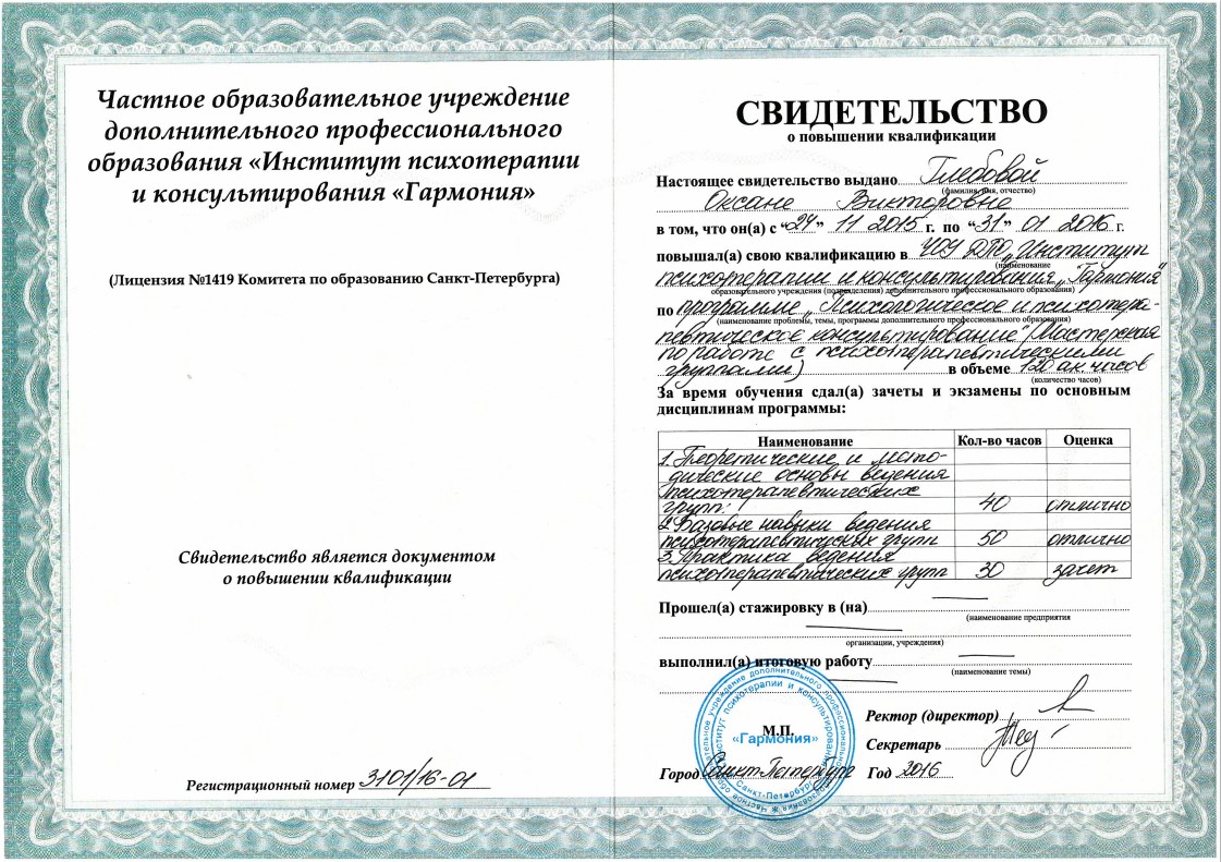 Слушатель 5-летнего курса по групповой психотерапии и групповым процессам израильского Института Группового Психоанализа (г. Хайфа, Израиль)