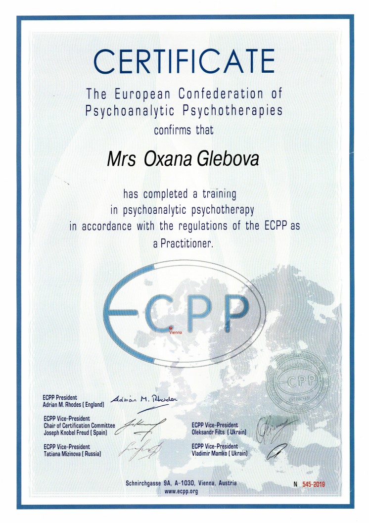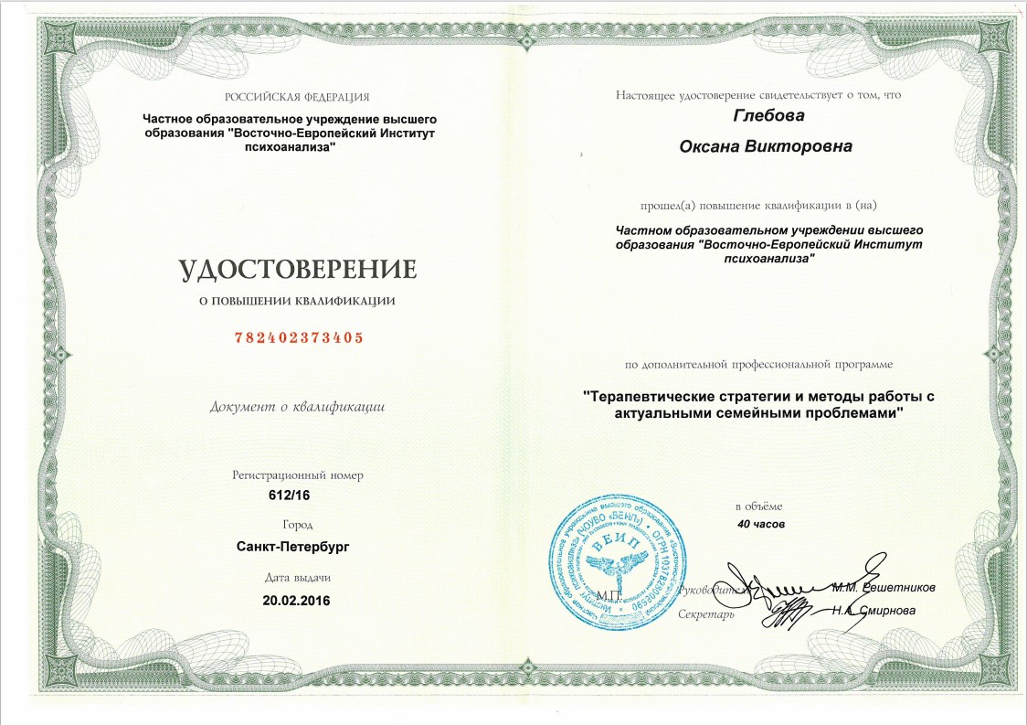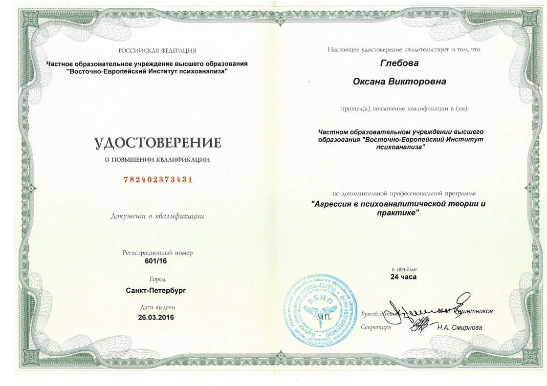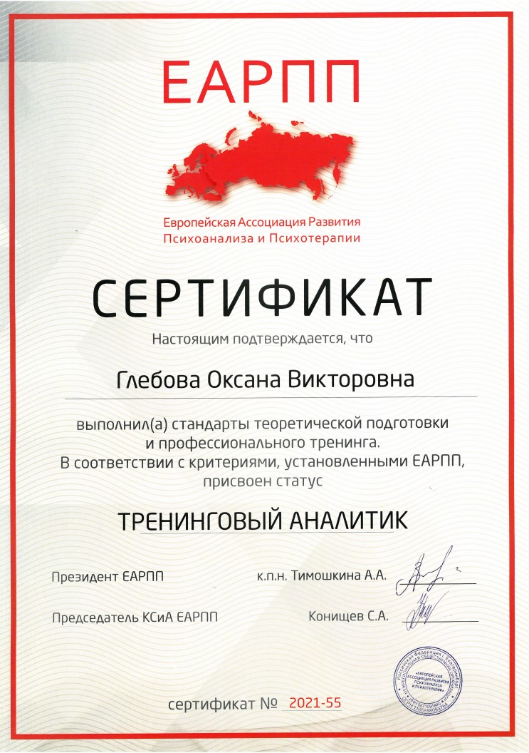 Слушатель 5-летнего курса по групповой психотерапии и групповым процессам израильского Института Группового Психоанализа (г. Хайфа, Израиль)