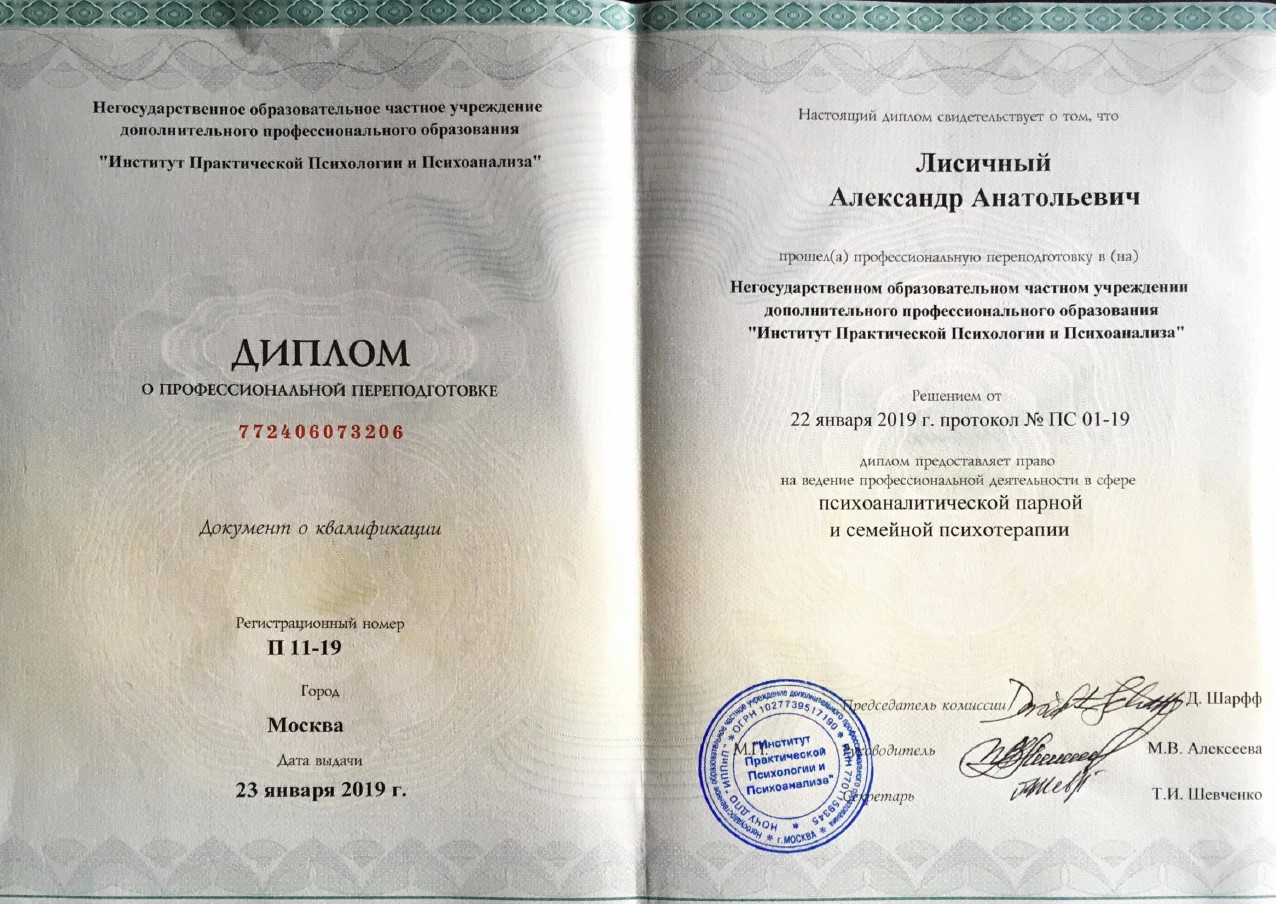 Филолог, кандидат филологических наук, магистр искусств (MA of arts in religion), клинический психолог, индивидуальный, семейный и парный психоаналитический психотерапевт, групповой психоаналитический психотерапевт.