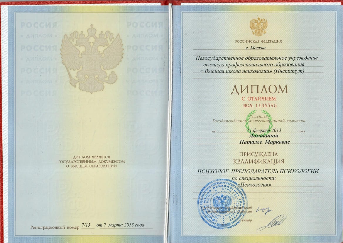 Высшая Школа Психологии при Институте психологии Российской Академии Наук (диплом с отличием ВСА 1134745); психолог, преподаватель психологии