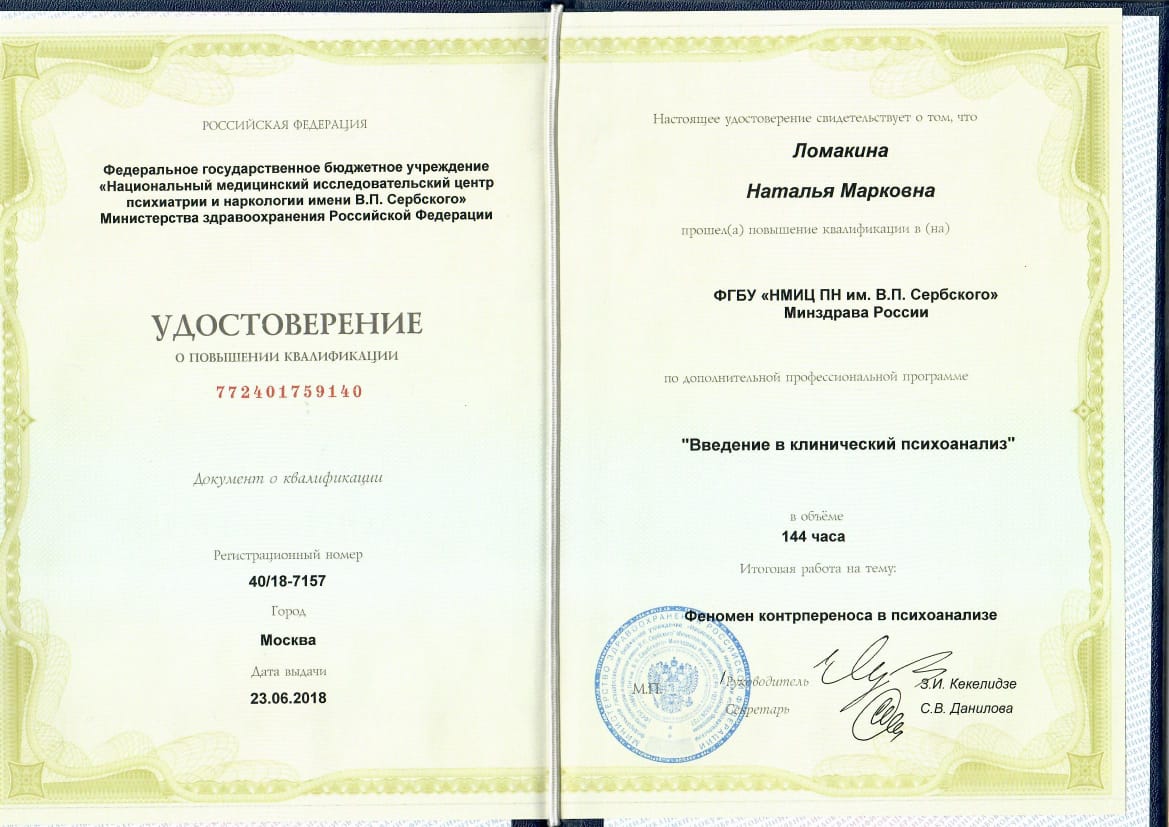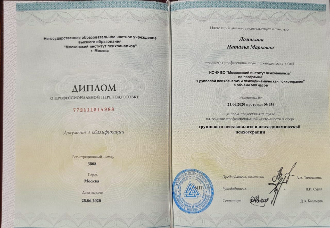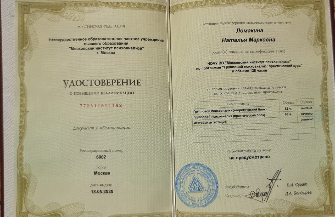 Московский институт психоанализа. Теория и практика группового и индивидуального психоанализа. Группаналитик.
