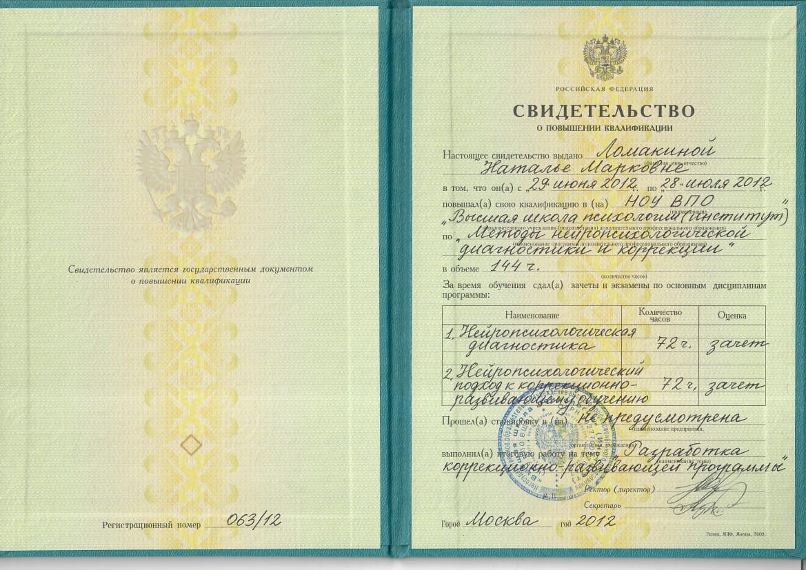 Программа дополнительного образования при Высшей Школе Психологии «Методы нейропсихологической диагностики и коррекции»;
