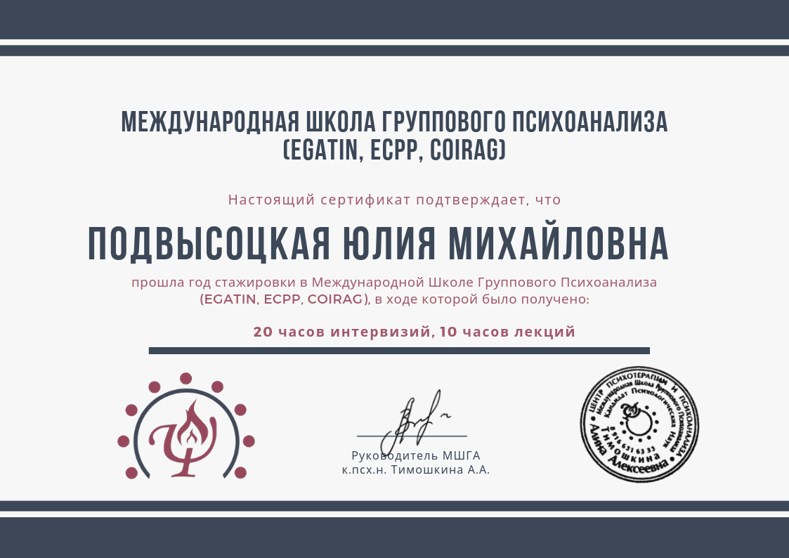 Стажировка в Международной Школе Группового Психоанализа (EGATIN, ECPP, COIRAG).