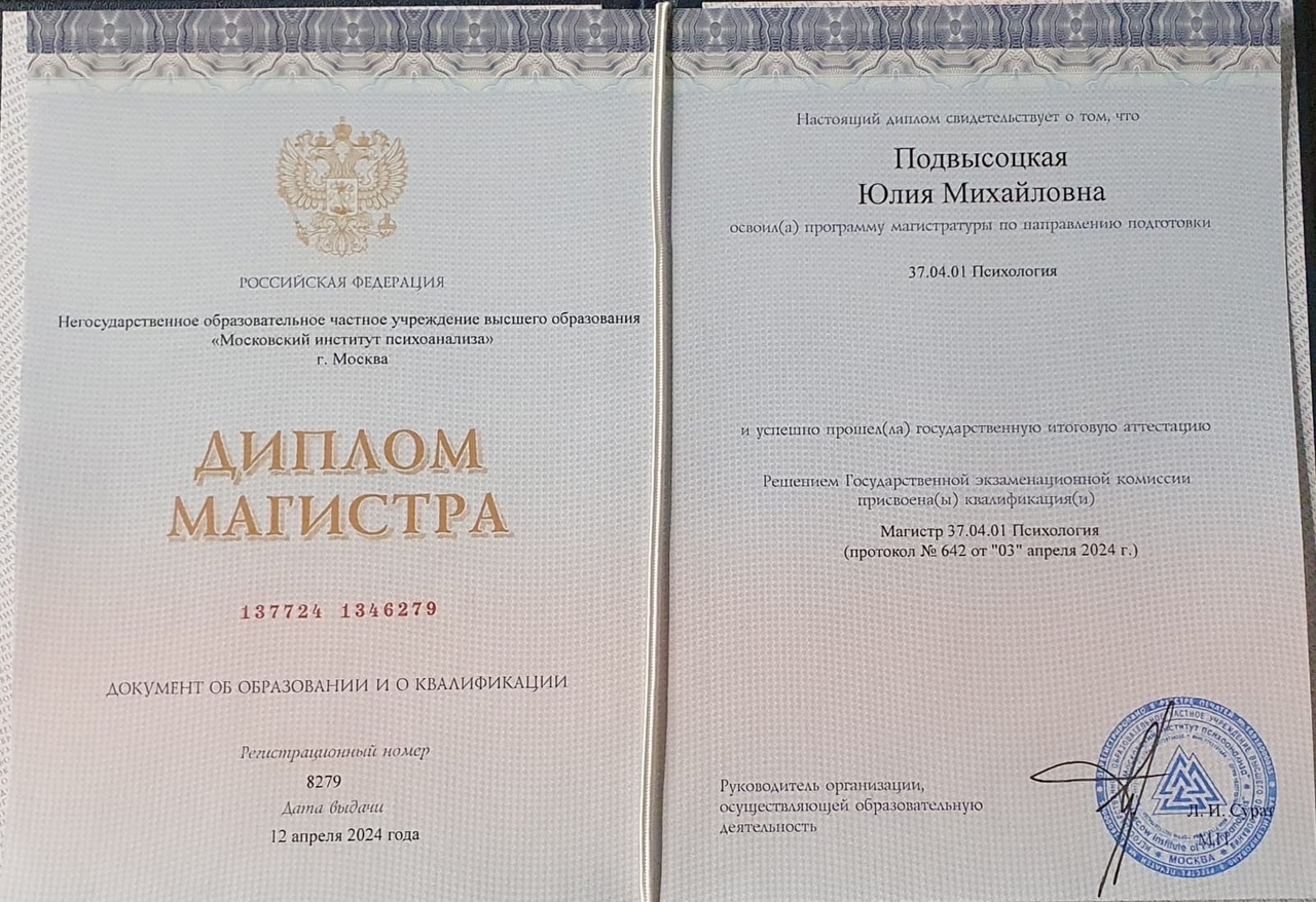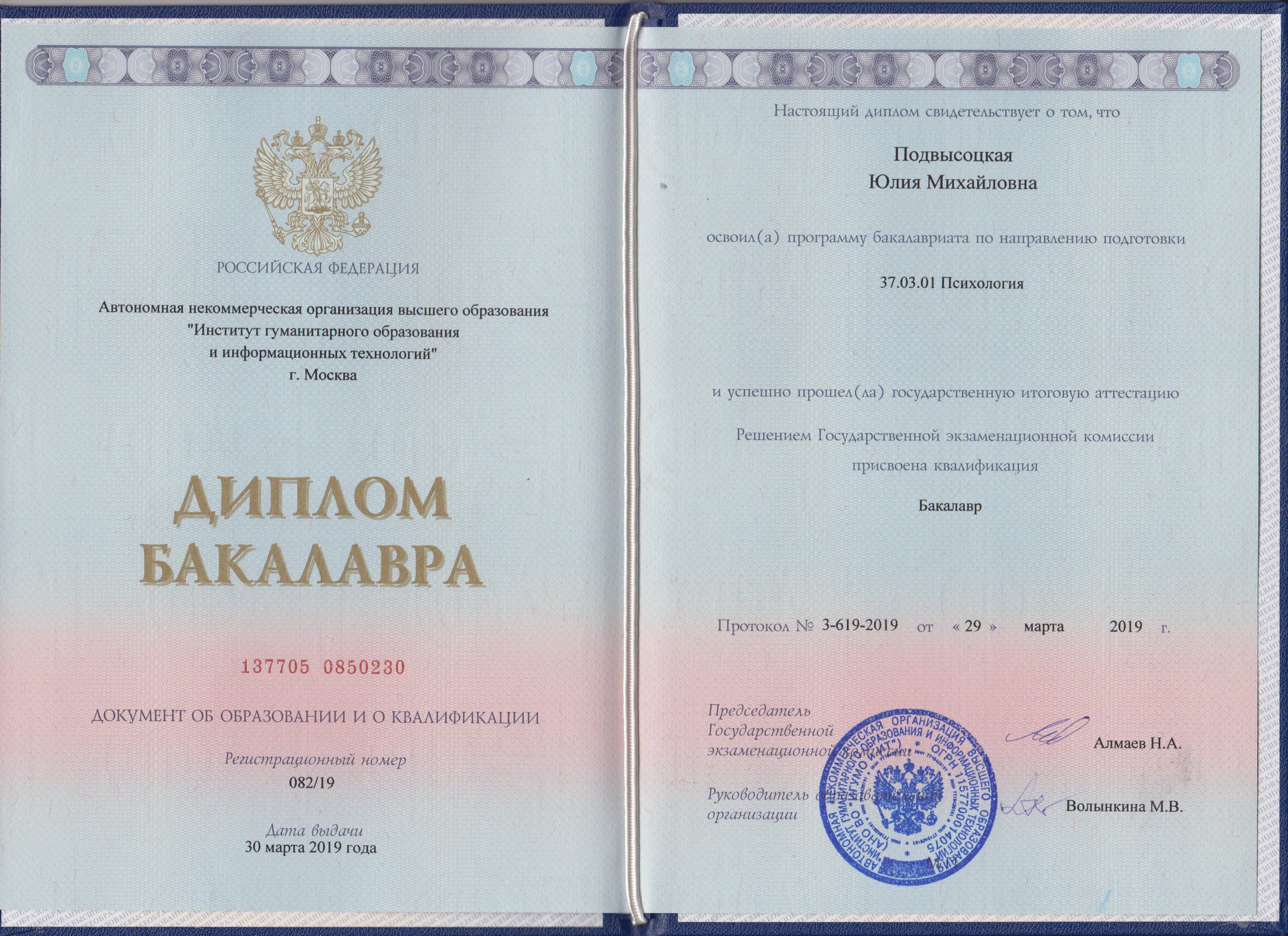 АНО ВО «ИГУМО и ИТ», г. Москва, бакалавр по направлению подготовки «Психология»;