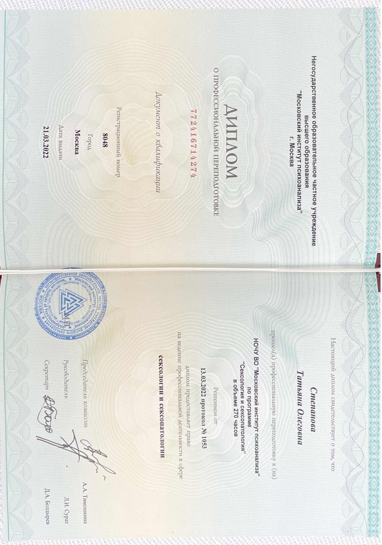 2021-2022 – НОЧУ ВО «Московский институт психоанализа», программа «Сексология и сексопатология», профессиональная переподготовка