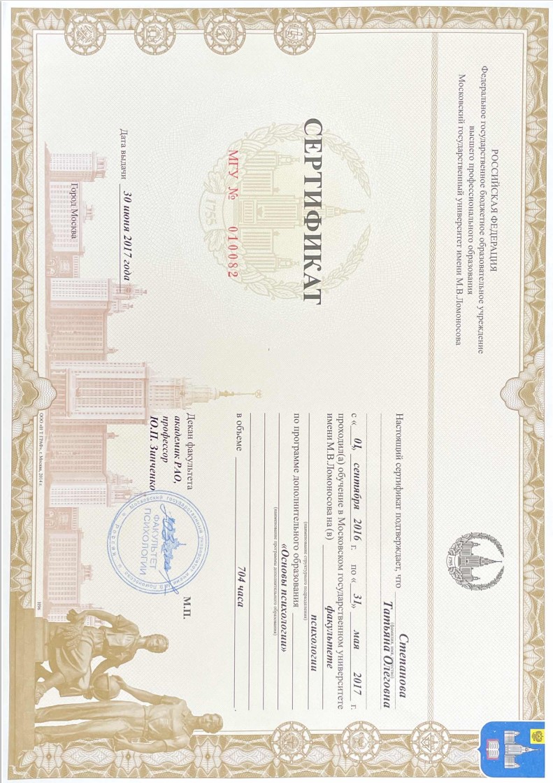 2016-2017 – МГУ им. М.В. Ломоносова, факультет психологии, программа «Основа психологии».